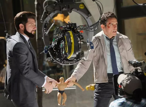 Framestore和MPC合作实现这个视觉特效,它看起来是“一个镜头”,但实际上是在三个不同的底片上拍摄的。首先Stiller是在纽约的火车站台上拍摄的,这个片段会转换到一个他使用钢丝跳跃的绿幕底片中。第三个底片是演员逃出大楼的片段。