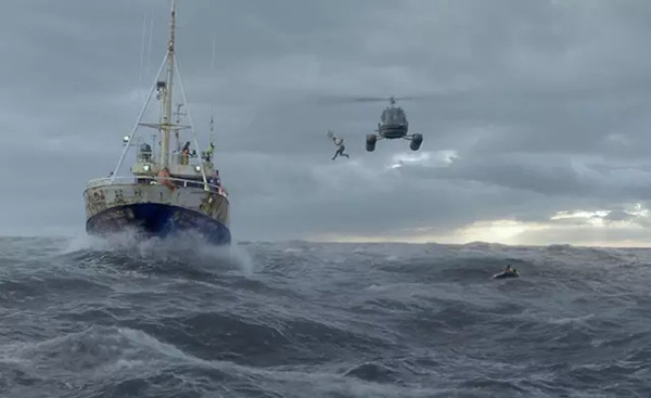 美化的现实:为了找到奥康纳,沃尔特奋不顾身地从直升机向一艘渔船跳下,但是没有跳到渔船上,而是冲向了在广阔海面上的一条鲨鱼。